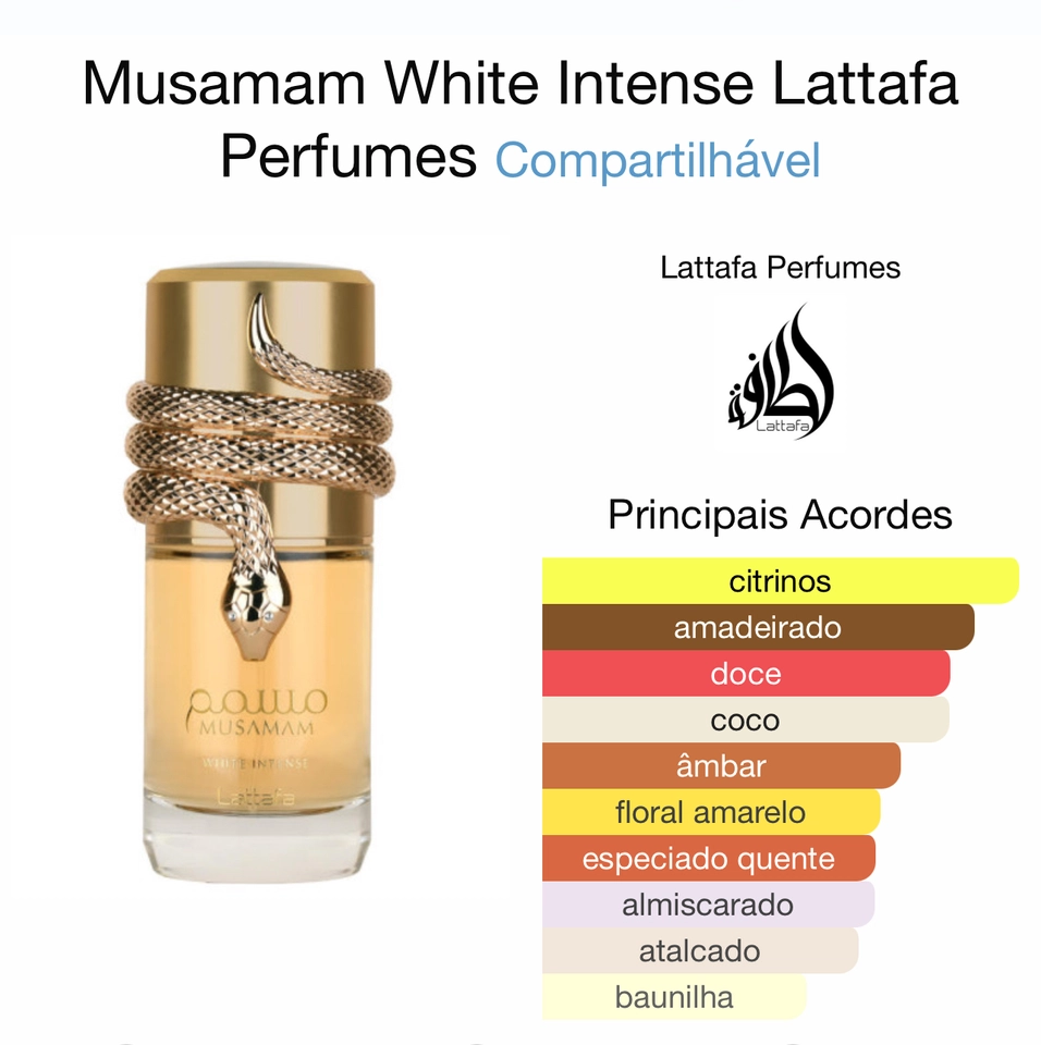 Musamam White Intense de Lattafa Perfumes Esta é uma nova fragrância. Musamam White Intense foi lançada em 2023. As notas de topo são: Bergamota, Laranja e Especiarias. As notas de coração são: Coco, Ylang Ylang, Ambroxan e Mahonial®. As notas de fundo são: Sândalo, Almíscar e Benjoim.